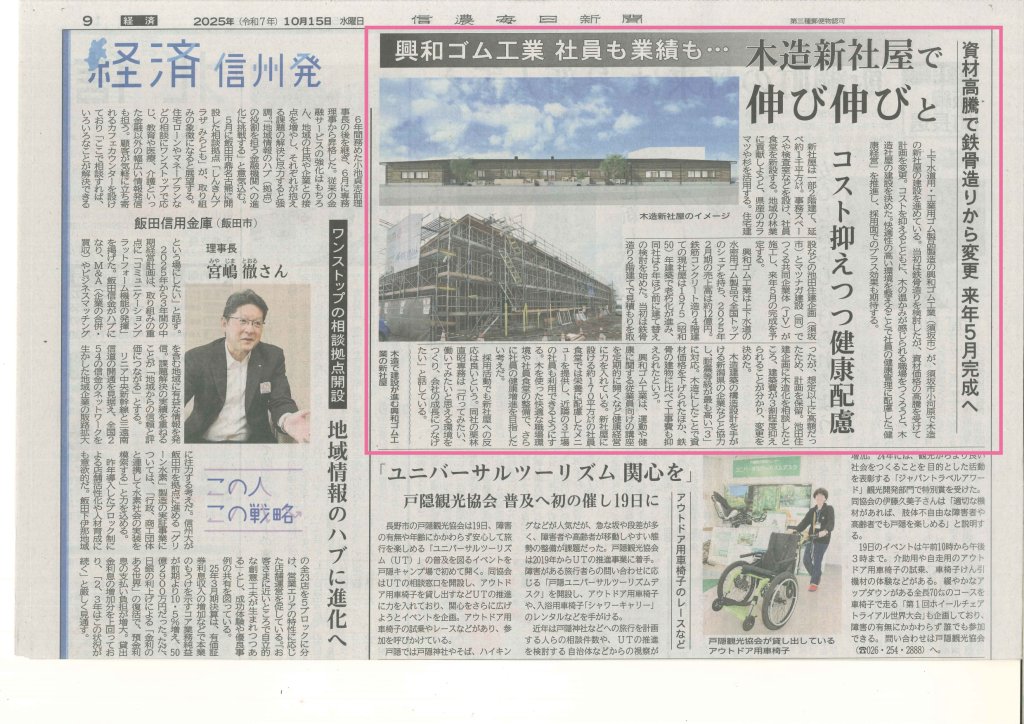 先日開催いたしましたセミナーでもご紹介した、木造非住宅物件「興和ゴム工業株式会社 社屋新築工事(約1,000㎡)」が、地域紙「信濃毎日新聞」に大きく取り上げられました。